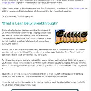 Wie bei Verizon Media zeigen Ihnen unsere Partner eventuell auch Werbung, von der sie annehmen, dass sie Ihren Interessen entspricht. In other words, spot fat loss is a myth; you can’t lose fat only—or even mostly—in your belly. 24/7 Online Support 60 Days Money Back Guarantee! Eating on a schedule, every couple of hours, will help reduce cravings and encourage readers to get in touch with hunger and satiety. At the top of the list are heart diseases and diabetes. The Lean Belly Breakthrough promises to have helped more than 100,000 men and women of all ages get to the root cause of their belly fat, heart disease, and diabetes. In fact, he claims the program will literally help you feel decades younger. And considering its overhyped sales video, lack of usable information, medically inaccurate promises (e.g. losing a pound per day, spot fat loss around the belly), and relatively high price, we think your money would be better spent making an appointment with your doctor, hiring a physical trainer, and/or speaking with a professional nutritionist.